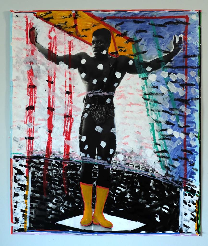 Central to Yacine’s art is an exploration of postcolonial identity – the complex sense of self for someone formed by both African heritage and Western influence. Yacine has described himself as operating from a “split identity between Blackness and Western Philosophy,” constructing his art as a “mural of archetypal cultural imagery” filtered through that dual perspective. His mixed-media works address the interplay of his African identity with a Westernized lifestyle, often interrogating how Black bodies and histories are represented (or erased) in a globalized society. For example, in A Postcolonial Landscape (2020), his paintings explicitly grappled with Black representation and erasure in art history, literally cutting into canvases to reveal the stretcher bars as a metaphor for the absence of Black artists on the traditional Eurocentric canvas. Every exuberant brushstroke and collage element in that series was an assertion of presence, a reclaiming of narrative from an art history that had long marginalized African voices.